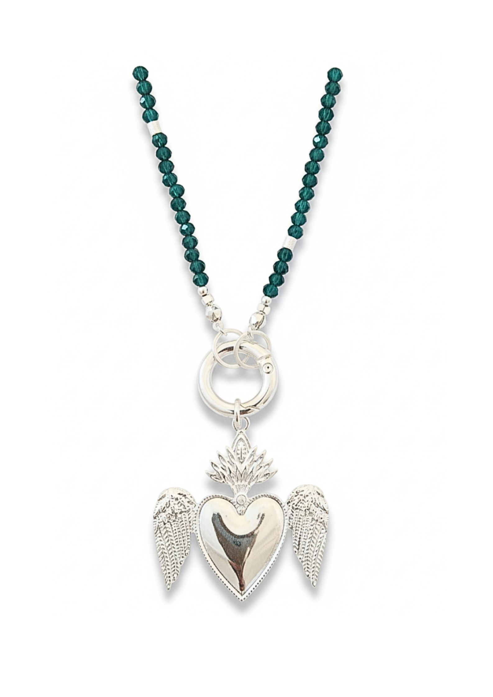 El Collar Corazón Alado Sagrado está bañado en plata y oro blanco mediante proceso electroquímico, logrando un brillo luminoso y duradero. Su dije central representa el Sagrado Corazón con alas, símbolo de fe, pureza y energía protectora, acompañado de alas que evocan libertad y guía espiritual.