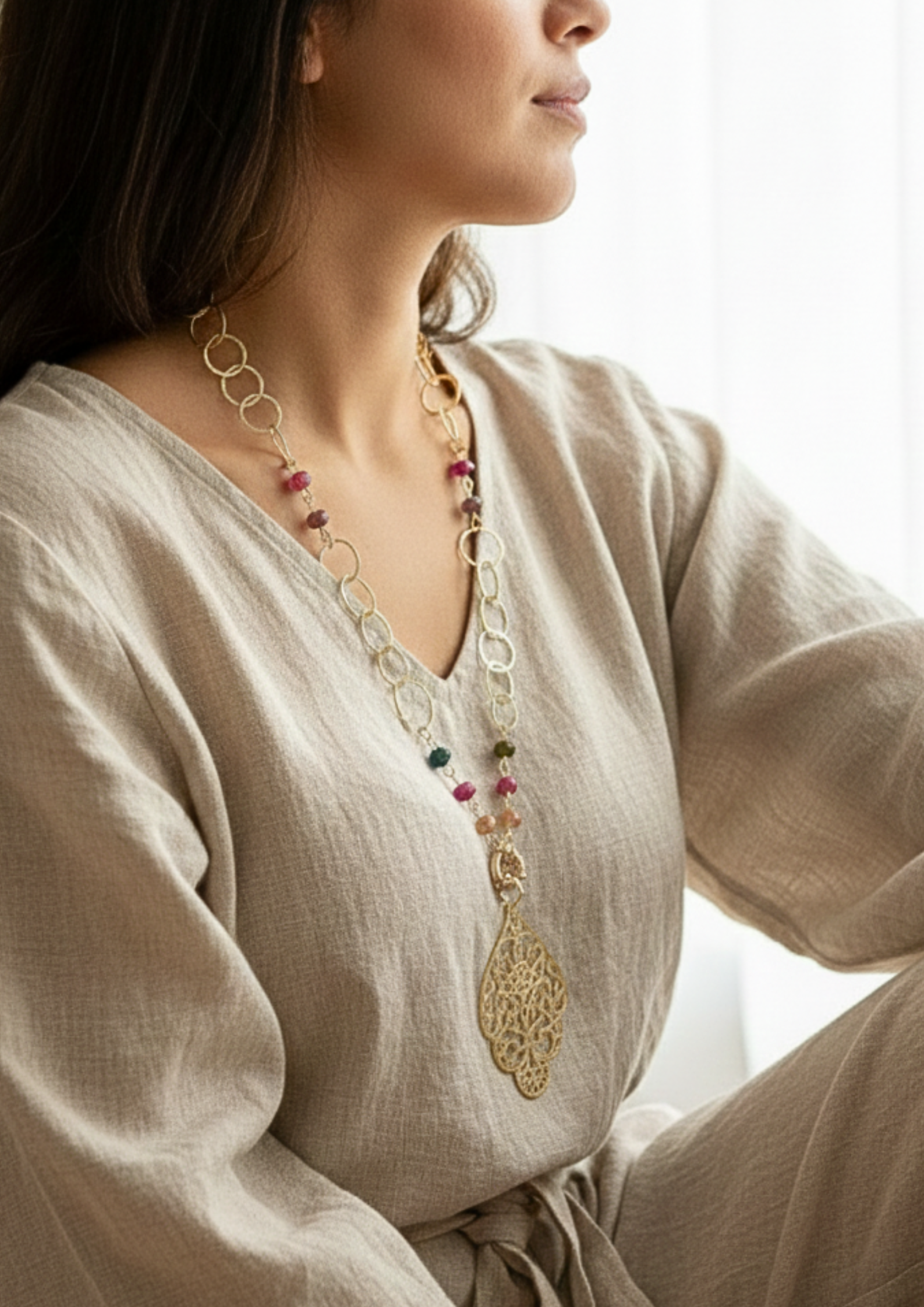• ​Descubre la majestuosidad de nuestro Collar Terra Turmalina, una pieza única diseñada para ser la protagonista de tu look. Este collar no es solo un accesorio, es una declaración de sofisticación y una fuente de energía vibrante.