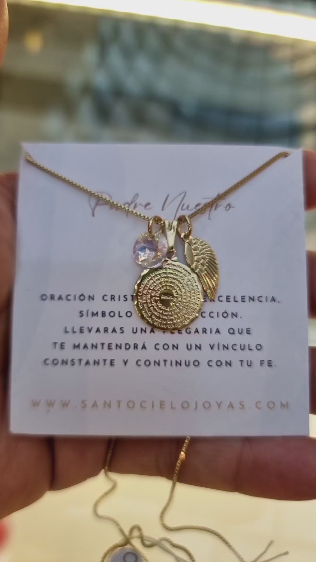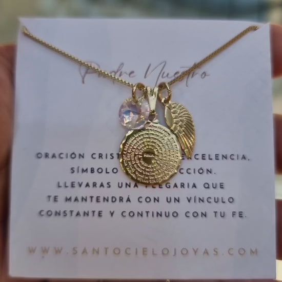 Hermoso y delicado collar con dije oración padre nuestro grabado, lleva un ala de Ángel que simboliza el Ángel de la guarda iluminado por un cristal Swarovski.